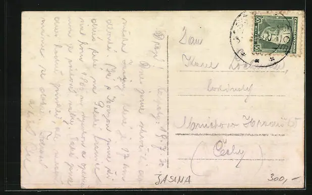 Personenbezogene Daten auf der Rückseite der Karte wurden durch blauen Textmarker unkenntlich gemacht. Die blauen Stellen sind auf die Vorderseite durchgeweicht und wirken sich negativ auf das Postkartenfoto aus