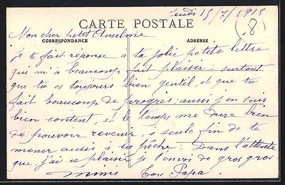 Personenbezogene Daten auf der Rückseite der Karte wurden durch blauen Textmarker unkenntlich gemacht. Die blauen Stellen sind auf die Vorderseite durchgeweicht und wirken sich negativ auf das Postkartenfoto aus