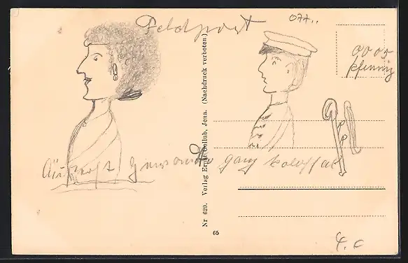 Personenbezogene Daten auf der Rückseite der Karte wurden durch blauen Textmarker unkenntlich gemacht. Die blauen Stellen sind auf die Vorderseite durchgeweicht und wirken sich negativ auf das Postkartenfoto aus