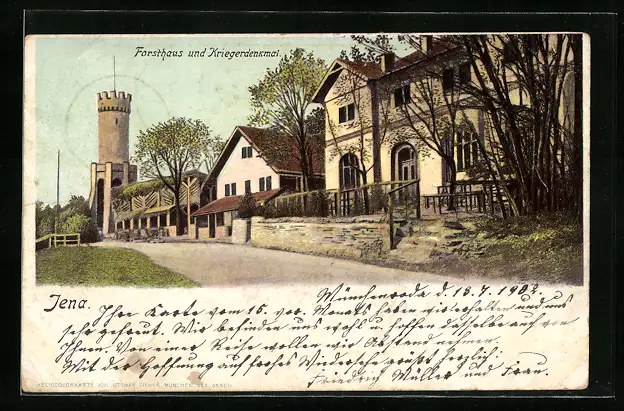 AK Jena, Gasthaus Forsthaus u. Kriegerdenkmal