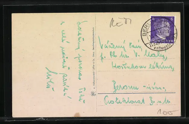 Personenbezogene Daten auf der Rückseite der Karte wurden durch blauen Textmarker unkenntlich gemacht. Die blauen Stellen sind auf die Vorderseite durchgeweicht und wirken sich negativ auf das Postkartenfoto aus
