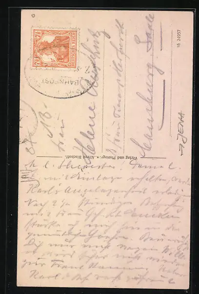 Personenbezogene Daten auf der Rückseite der Karte wurden durch blauen Textmarker unkenntlich gemacht. Die blauen Stellen sind auf die Vorderseite durchgeweicht und wirken sich negativ auf das Postkartenfoto aus