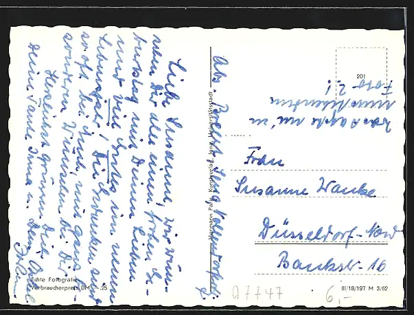 Personenbezogene Daten auf der Rückseite der Karte wurden durch blauen Textmarker unkenntlich gemacht. Die blauen Stellen sind auf die Vorderseite durchgeweicht und wirken sich negativ auf das Postkartenfoto aus