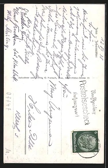 Personenbezogene Daten auf der Rückseite der Karte wurden durch blauen Textmarker unkenntlich gemacht. Die blauen Stellen sind auf die Vorderseite durchgeweicht und wirken sich negativ auf das Postkartenfoto aus