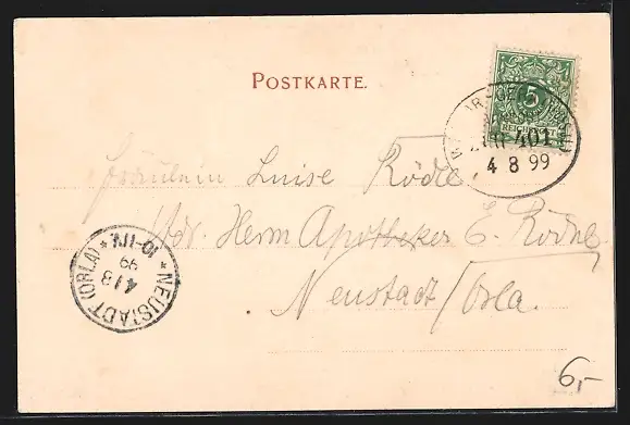 alte Ansichtskarte, gelaufen 1899, Stempelspur, guter Zustand