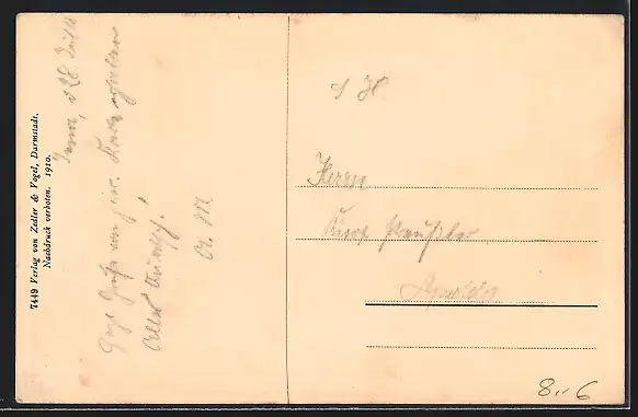 Personenbezogene Daten auf der Rückseite der Karte wurden durch blauen Textmarker unkenntlich gemacht. Die blauen Stellen sind auf die Vorderseite durchgeweicht und wirken sich negativ auf das Postkartenfoto aus
