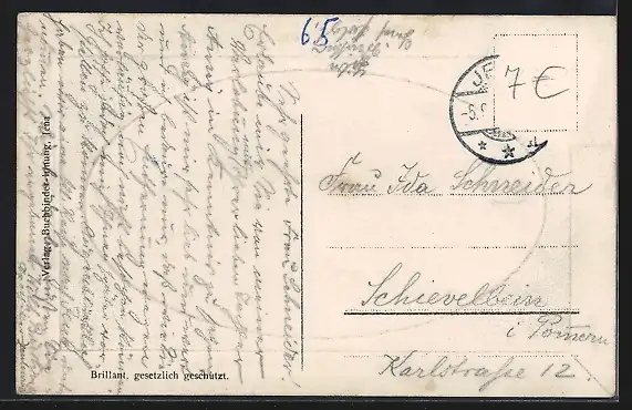 Personenbezogene Daten auf der Rückseite der Karte wurden durch blauen Textmarker unkenntlich gemacht. Die blauen Stellen sind auf die Vorderseite durchgeweicht und wirken sich negativ auf das Postkartenfoto aus