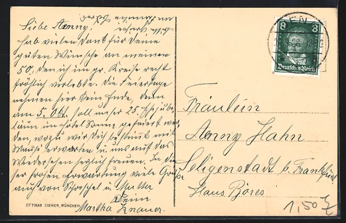 Personenbezogene Daten auf der Rückseite der Karte wurden durch blauen Textmarker unkenntlich gemacht. Die blauen Stellen sind auf die Vorderseite durchgeweicht und wirken sich negativ auf das Postkartenfoto aus