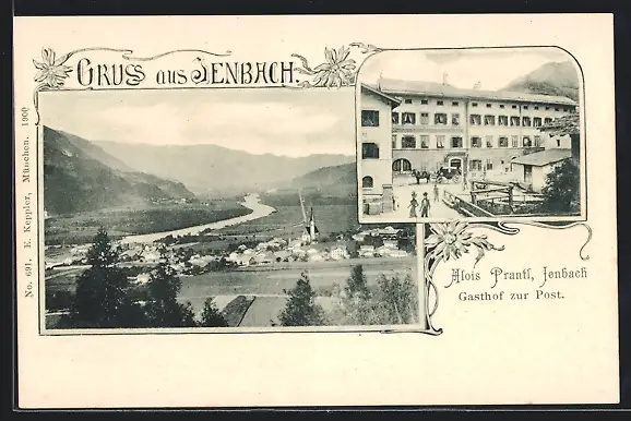 AK Jenbach, Gasthof zur Post v. Alois Prantl, Totalansicht mit Umgebung