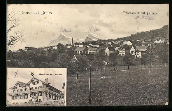 AK Jenins, Gasthaus zur Bündte, Totalansicht mit Falknis