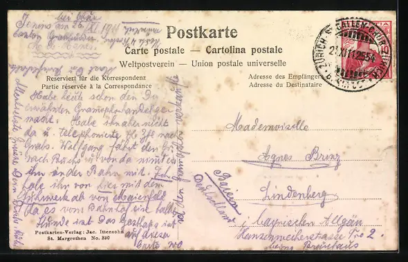 Personenbezogene Daten auf der Rückseite der Karte wurden durch blauen Textmarker unkenntlich gemacht. Die blauen Stellen sind auf die Vorderseite durchgeweicht und wirken sich negativ auf das Postkartenfoto aus