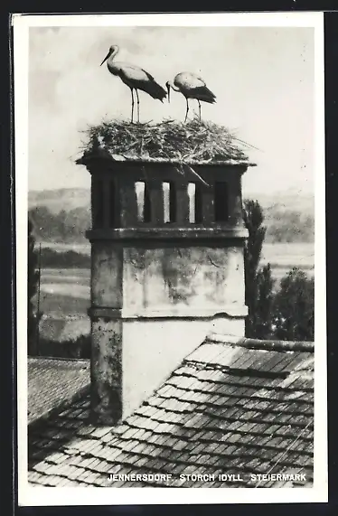 AK Jennersdorf, Storch Idyll, Nester auf Schornstein
