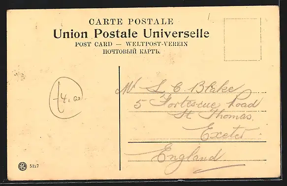 Personenbezogene Daten auf der Rückseite der Karte wurden durch blauen Textmarker unkenntlich gemacht. Die blauen Stellen sind auf die Vorderseite durchgeweicht und wirken sich negativ auf das Postkartenfoto aus
