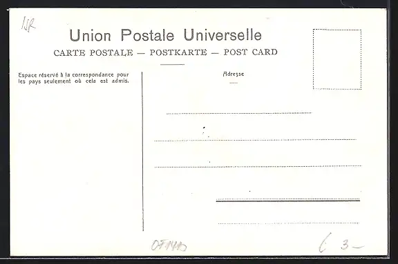 Personenbezogene Daten auf der Rückseite der Karte wurden durch blauen Textmarker unkenntlich gemacht. Die blauen Stellen sind auf die Vorderseite durchgeweicht und wirken sich negativ auf das Postkartenfoto aus