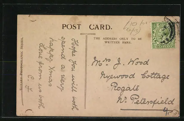 Personenbezogene Daten auf der Rückseite der Karte wurden durch blauen Textmarker unkenntlich gemacht. Die blauen Stellen sind auf die Vorderseite durchgeweicht und wirken sich negativ auf das Postkartenfoto aus