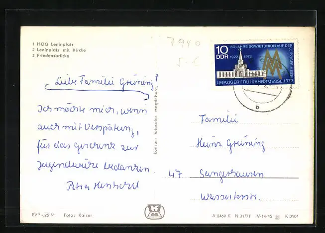 Personenbezogene Daten auf der Rückseite der Karte wurden durch blauen Textmarker unkenntlich gemacht. Die blauen Stellen sind auf die Vorderseite durchgeweicht und wirken sich negativ auf das Postkartenfoto aus