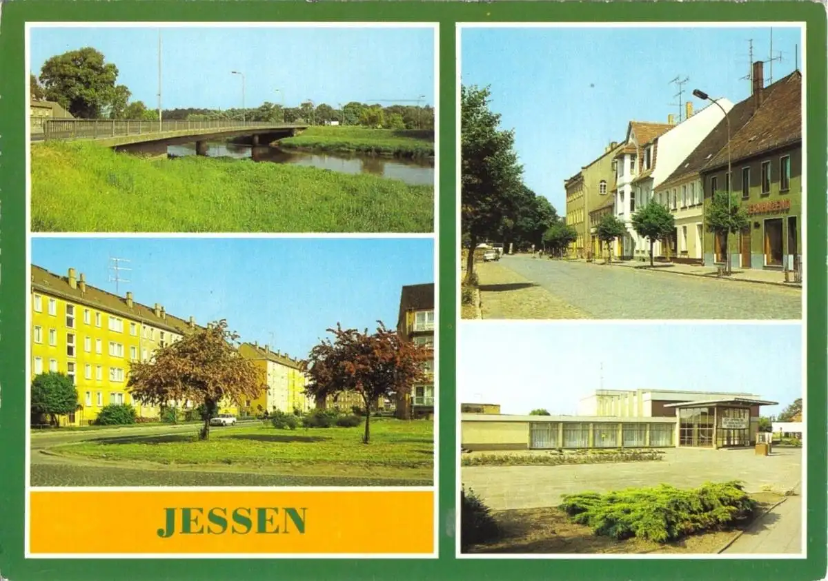 Ansichtskarte Jessen Elster vier Abb. - Elsterbrücke, Heinrich-Rau-Str., Ernst-Thälmann-Str., Kulturhaus Erhaltung I-II ungelaufen Druckvermerk: 1986 Herstellungsland: DDR Verlag: Bild und Heimat, Reichenbach i. V. - 01 06 0176/15