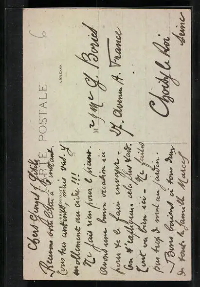 Personenbezogene Daten auf der Rückseite der Karte wurden durch blauen Textmarker unkenntlich gemacht. Die blauen Stellen sind auf die Vorderseite durchgeweicht und wirken sich negativ auf das Postkartenfoto aus