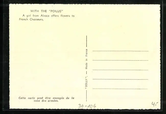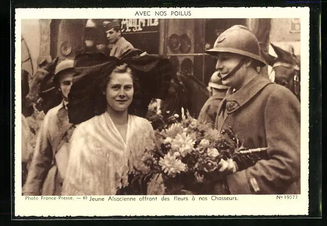 AK Jeune Alsacienne offrant des fleurs à nos Chasseurs