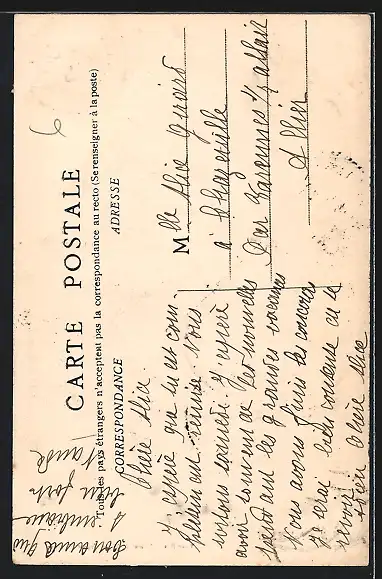 Personenbezogene Daten auf der Rückseite der Karte wurden durch blauen Textmarker unkenntlich gemacht. Die blauen Stellen sind auf die Vorderseite durchgeweicht und wirken sich negativ auf das Postkartenfoto aus