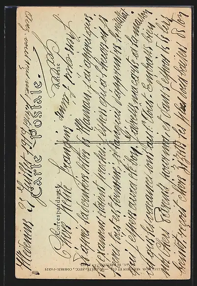 Personenbezogene Daten auf der Rückseite der Karte wurden durch blauen Textmarker unkenntlich gemacht. Die blauen Stellen sind auf die Vorderseite durchgeweicht und wirken sich negativ auf das Postkartenfoto aus