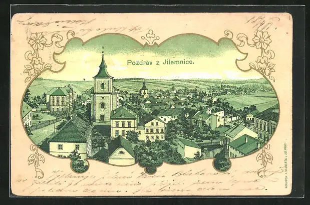AK Jilemnice, Ortsansicht aus der Vogelschau, Vergoldeter Rahmen