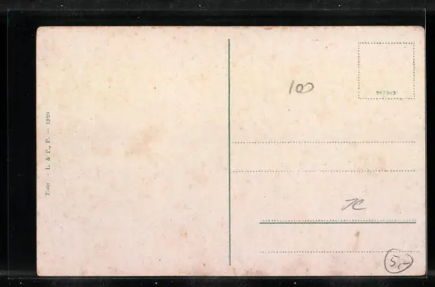 Personenbezogene Daten auf der Rückseite der Karte wurden durch blauen Textmarker unkenntlich gemacht. Die blauen Stellen sind auf die Vorderseite durchgeweicht und wirken sich negativ auf das Postkartenfoto aus