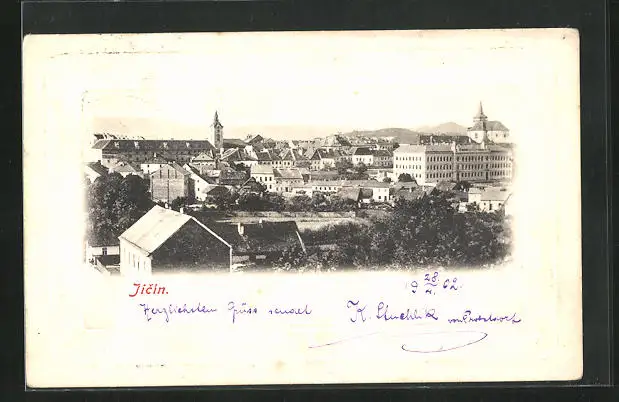 AK Jitschin / Gitschin / Jicin, Teilansicht der Stadt mit Kirche