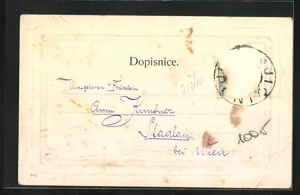Personenbezogene Daten auf der Rückseite der Karte wurden durch blauen Textmarker unkenntlich gemacht. Die blauen Stellen sind auf die Vorderseite durchgeweicht und wirken sich negativ auf das Postkartenfoto aus