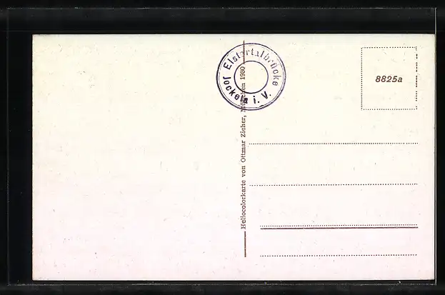 Personenbezogene Daten auf der Rückseite der Karte wurden durch blauen Textmarker unkenntlich gemacht. Die blauen Stellen sind auf die Vorderseite durchgeweicht und wirken sich negativ auf das Postkartenfoto aus
