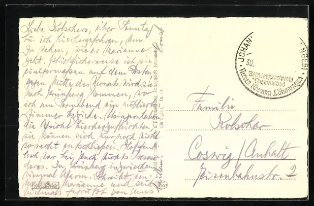 Personenbezogene Daten auf der Rückseite der Karte wurden durch blauen Textmarker unkenntlich gemacht. Die blauen Stellen sind auf die Vorderseite durchgeweicht und wirken sich negativ auf das Postkartenfoto aus
