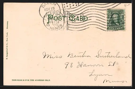 Personenbezogene Daten auf der Rückseite der Karte wurden durch blauen Textmarker unkenntlich gemacht. Die blauen Stellen sind auf die Vorderseite durchgeweicht und wirken sich negativ auf das Postkartenfoto aus