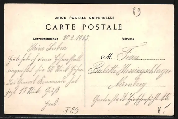 Personenbezogene Daten auf der Rückseite der Karte wurden durch blauen Textmarker unkenntlich gemacht. Die blauen Stellen sind auf die Vorderseite durchgeweicht und wirken sich negativ auf das Postkartenfoto aus
