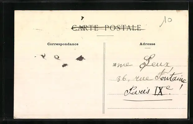 Personenbezogene Daten auf der Rückseite der Karte wurden durch blauen Textmarker unkenntlich gemacht. Die blauen Stellen sind auf die Vorderseite durchgeweicht und wirken sich negativ auf das Postkartenfoto aus