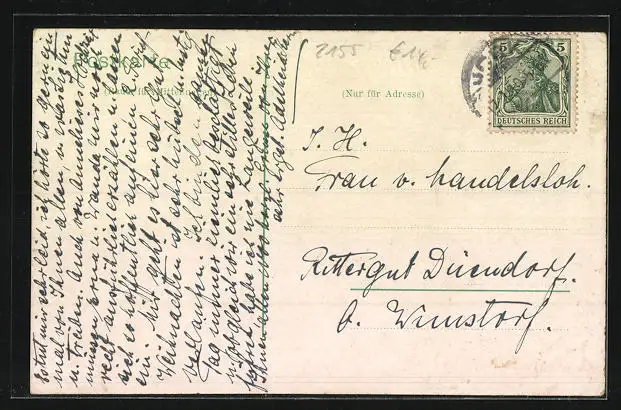 Personenbezogene Daten auf der Rückseite der Karte wurden durch blauen Textmarker unkenntlich gemacht. Die blauen Stellen sind auf die Vorderseite durchgeweicht und wirken sich negativ auf das Postkartenfoto aus