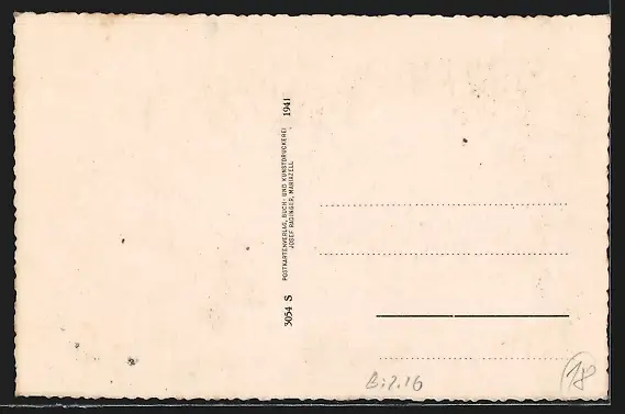 Personenbezogene Daten auf der Rückseite der Karte wurden durch blauen Textmarker unkenntlich gemacht. Die blauen Stellen sind auf die Vorderseite durchgeweicht und wirken sich negativ auf das Postkartenfoto aus