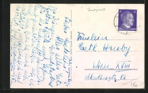 Personenbezogene Daten auf der Rückseite der Karte wurden durch blauen Textmarker unkenntlich gemacht. Die blauen Stellen sind auf die Vorderseite durchgeweicht und wirken sich negativ auf das Postkartenfoto aus
