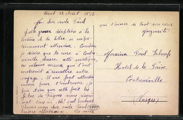Personenbezogene Daten auf der Rückseite der Karte wurden durch blauen Textmarker unkenntlich gemacht. Die blauen Stellen sind auf die Vorderseite durchgeweicht und wirken sich negativ auf das Postkartenfoto aus