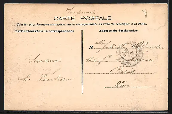 Personenbezogene Daten auf der Rückseite der Karte wurden durch blauen Textmarker unkenntlich gemacht. Die blauen Stellen sind auf die Vorderseite durchgeweicht und wirken sich negativ auf das Postkartenfoto aus