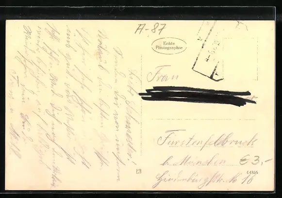 Personenbezogene Daten auf der Rückseite der Karte wurden durch blauen Textmarker unkenntlich gemacht. Die blauen Stellen sind auf die Vorderseite durchgeweicht und wirken sich negativ auf das Postkartenfoto aus