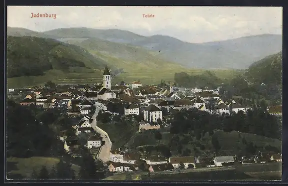 AK Judenburg, Totalansicht mit Strasse und Bergpanorama aus der Vogelschau