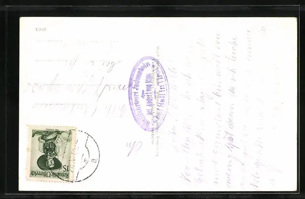 Personenbezogene Daten auf der Rückseite der Karte wurden durch blauen Textmarker unkenntlich gemacht. Die blauen Stellen sind auf die Vorderseite durchgeweicht und wirken sich negativ auf das Postkartenfoto aus