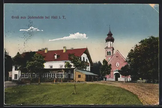 AK Judenstein bei Hall, Strassenpartie mit Kirche