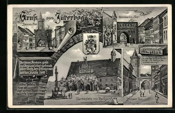AK Jüterbog, Neumarkt-Tor, Marktplatz mit Rathaus, Stadtwappen