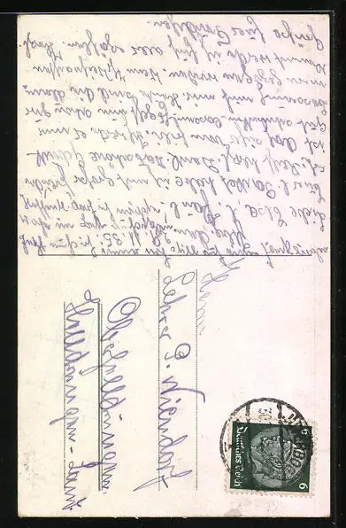 Personenbezogene Daten auf der Rückseite der Karte wurden durch blauen Textmarker unkenntlich gemacht. Die blauen Stellen sind auf die Vorderseite durchgeweicht und wirken sich negativ auf das Postkartenfoto aus