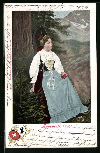 AK Junge Appenzellerin in Tracht vor Bergkulisse, Wappen