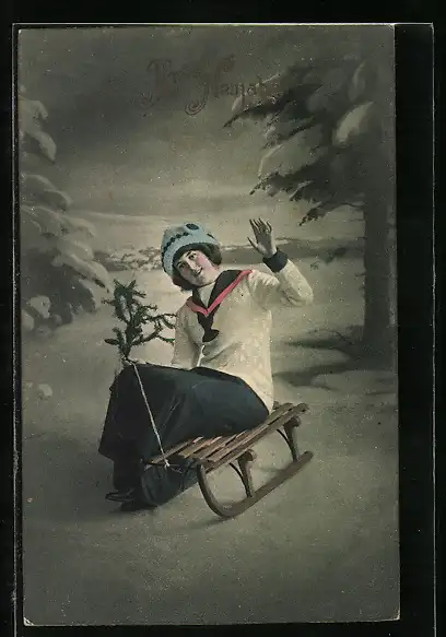 AK Junge Dame auf einem Rodelschlitten