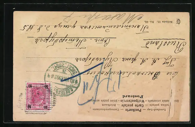 Personenbezogene Daten auf der Rückseite der Karte wurden durch blauen Textmarker unkenntlich gemacht. Die blauen Stellen sind auf die Vorderseite durchgeweicht und wirken sich negativ auf das Postkartenfoto aus