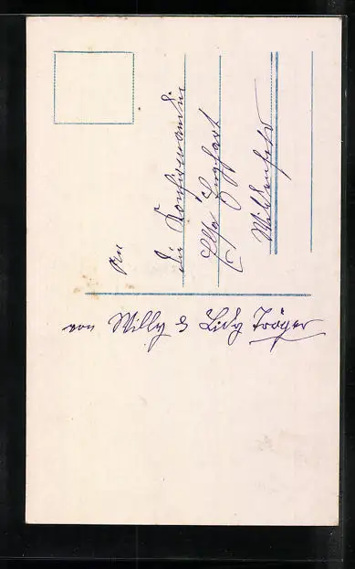 Personenbezogene Daten auf der Rückseite der Karte wurden durch blauen Textmarker unkenntlich gemacht. Die blauen Stellen sind auf die Vorderseite durchgeweicht und wirken sich negativ auf das Postkartenfoto aus