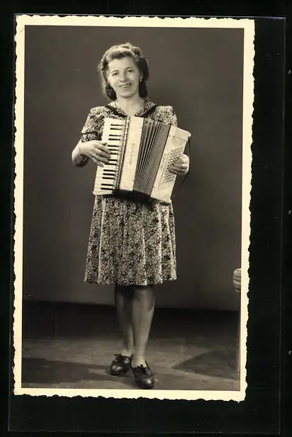 AK Junge Dame stehend mit ihrem Akkordeon im Fotostudio